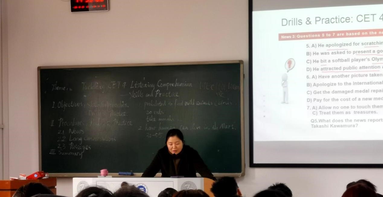 杨老师首先介绍大学英语四级考试听力理解部分由短篇新闻、长对话和听力篇章构成,并针对这几个部分图文并茂地和学生们沟通交流了基本的听力策略,如浏览听力选项,找出关键词;根据选项预测题干、听力主题和主要内容;确定听音重点,记录主要相关信息。尤其是短篇新闻的听力理解要明了新闻报道常采用的倒金字塔结构,关注新闻首句信息、新闻题材等。接着杨老师通过三篇新闻给学生进行训练,并和学生们就新闻主题进行了简短讨论,将思政元素自然地融入课堂。