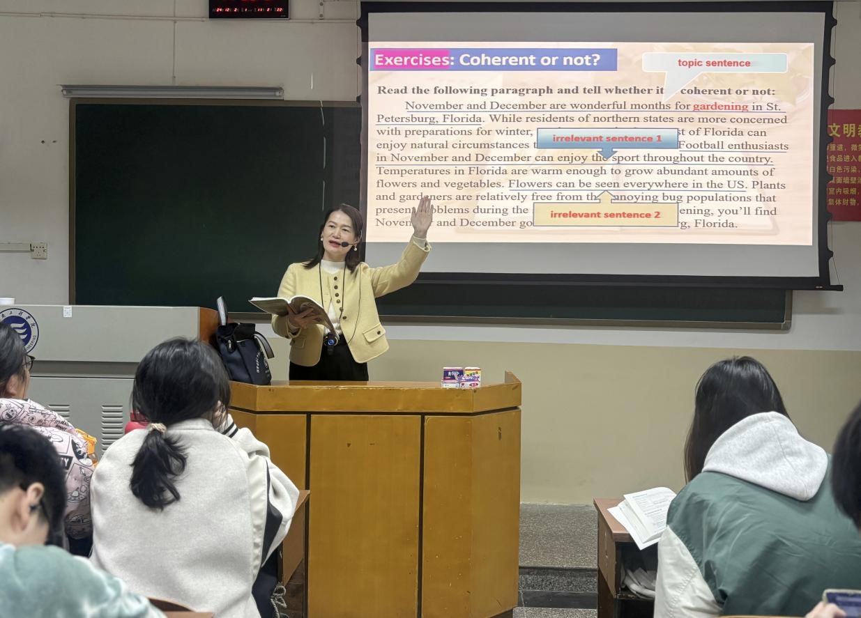 周老师的公开课以《英语写作(1)》第13单元:Paragraph Coherence为授课内容,授课对象为英语2381和2382两个班的学生。首先,周老师对上次课的内容“Paragraph Unity”(段落的统一性)进行了回顾,结合“超星学习通”平台上布置的作业进一步巩固已学知识,同时通过与unity有关的名言引入思政元素。然后,从“What is coherence?”(什么是连贯性?)和”How to achieve coherence?”(如何实现连贯?)两个部分展开新知识的传授,主要聚焦“logical order of information”(信息的逻辑排列)等内容。整个教学过程紧扣 “coherence”(连贯性)这一主题,辅以多个实例,层层递进,讲练结合,以问题启发学生思考,在训练写作技能的同时培养逻辑思维能力。最后,由写作中的“连贯性”引入中国“五年规划”的连贯性及其取得的成就,要求学生课后进一步阅读CGTN的相关报道,观看东方卫视《这就是中国》第85期节目:五年规划的力量,深入了解五年规划彰显的制度优势并就此主题进行短文写作,从而激发制度自信。周旭阳老师备课充分,教学素材丰富,教学方法多样,利用了中国大学MOOC、学习通、批改网、B站等多个平台的资源,运用了多种信息化教学手段,并在多处融入了“团结”“连贯性”“制度自信”等思政元素。课堂上教态自然亲切,讲解条理清晰,师生互动积极,课堂气氛活跃。