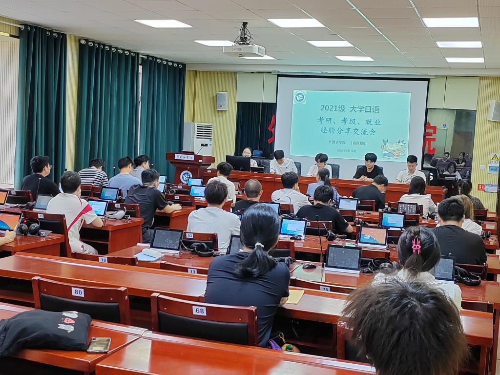 经验分享环节中,胡科文、何文杰、何泉喜、冯浩宇详细讲解了日语203考研的备考流程与书籍推荐;刘昊齐则结合自身经历,分享了“考研+就业”的双线准备策略,建议同学们合理安排时间、双手准备。在互动提问中,学生们就择校、专业选择及复习规划等积极发问,现场气氛热烈,收获颇丰。