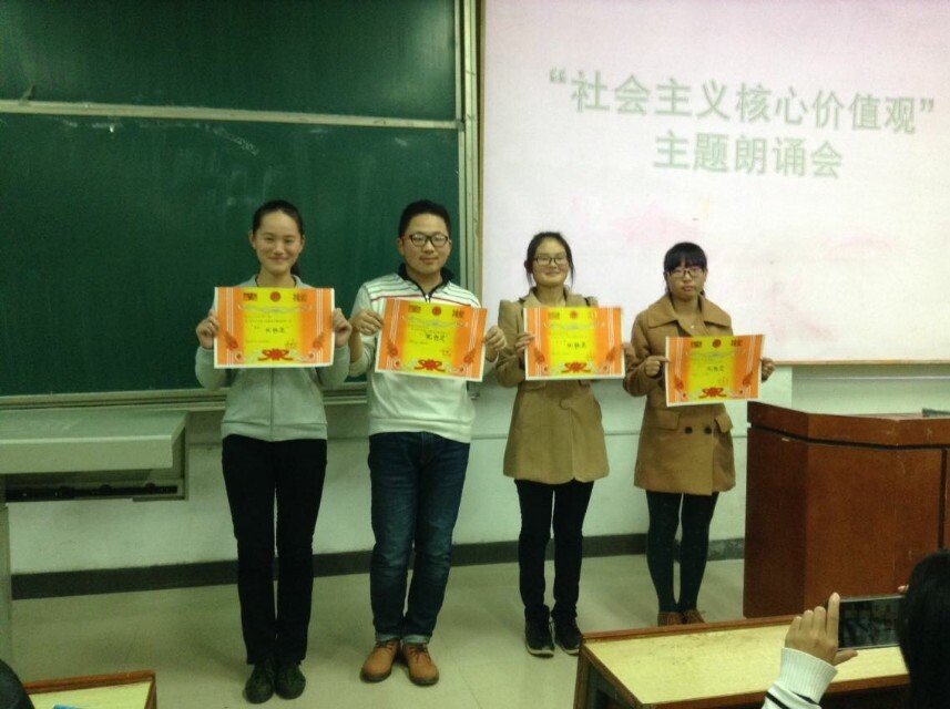 2014年11月20日晚7点,日韩暴力性猛交内射老熟妇“社会主义核心价值观”朗诵比赛于新校区主教学楼D102举行。大一新生耿峥嵘、李雨洁主持了此次朗诵会,全体大一新生聆听了朗诵。覃万香荣获比赛第一名,吴晓艺荣获第二名,罗斯同荣获第三名,胡帅取得了第四名的好成绩。