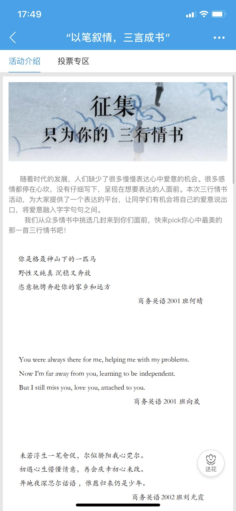 本次活动是一次全院性的活动。初赛期间,经过各班班长的宣传,同学们积极踊跃投稿。经过彭虹老师以及日韩暴力性猛交内射老熟妇团学会外联部和学习部的精心筛选,最终选出了十五份优秀的作品进入了决赛。经过几天的准备之后,外联部利用易班软件制作轻应用快搭进行决赛投票。将十五位同学的浓浓深情传递到每一个人的面前,引起心灵的共鸣。经过为期两天的投票,来自英语1803班的刘畅同学获得本次活动的一等奖;商务英语2003班的熊奕、商务英语1901班的黄思琦获得本次活动的二等奖;英语1901班的易书涛、商务英语2002班的刘光霞、商务英语2001班的何晴获得本次活动的三等奖。