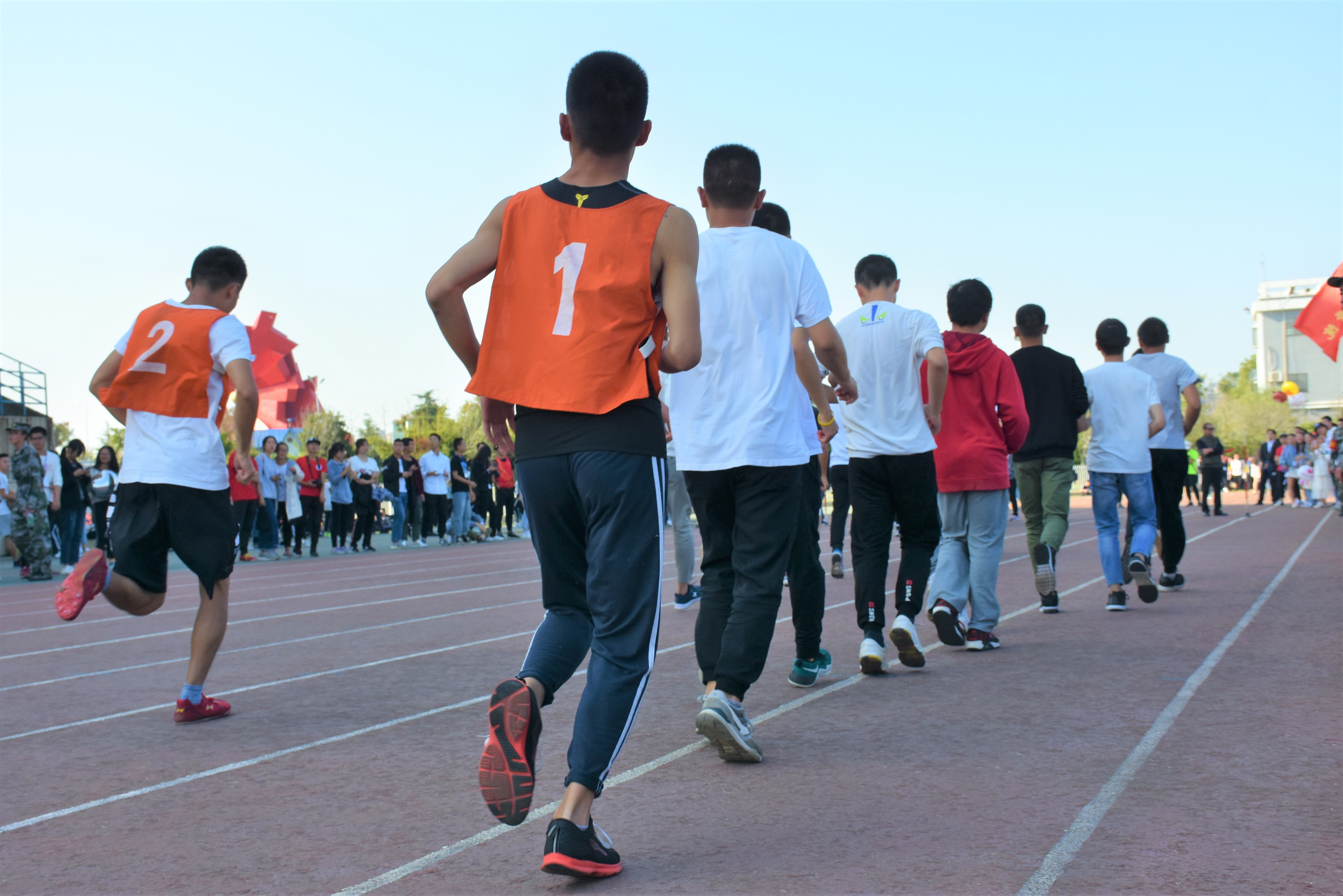 开幕式结束后,伴随着清晨第一声枪响,校运会正式开始。塑胶跑道上,短跑运动员们身姿矫健,奋勇向前,他们心里只有终点;在长跑的征途中,他们一步一步的坚持着,脚步沉重,呼吸凝重,可是,没人想到放弃,因为加油呐喊声一直在耳边回响;在接力赛中,火红的接力棒在队员们手中不停传递,以惊人的默契和毅力冲向终点。与此同时,在操场中央,跳远,铅球,标枪,跳高等项目也正进行,映入眼帘的,是一道道完美的曲线,起跳、纵身一跃、落地......选手们每个动作的完成,都引得围观同学阵阵欢呼。26日下午14:40,比赛进行到20*60米迎面接力赛。短短的60米赛道上,运动员们进行一棒又一棒的接力,观众的呐喊一浪高过一浪,将运动会推向高潮。