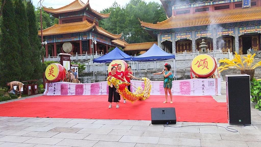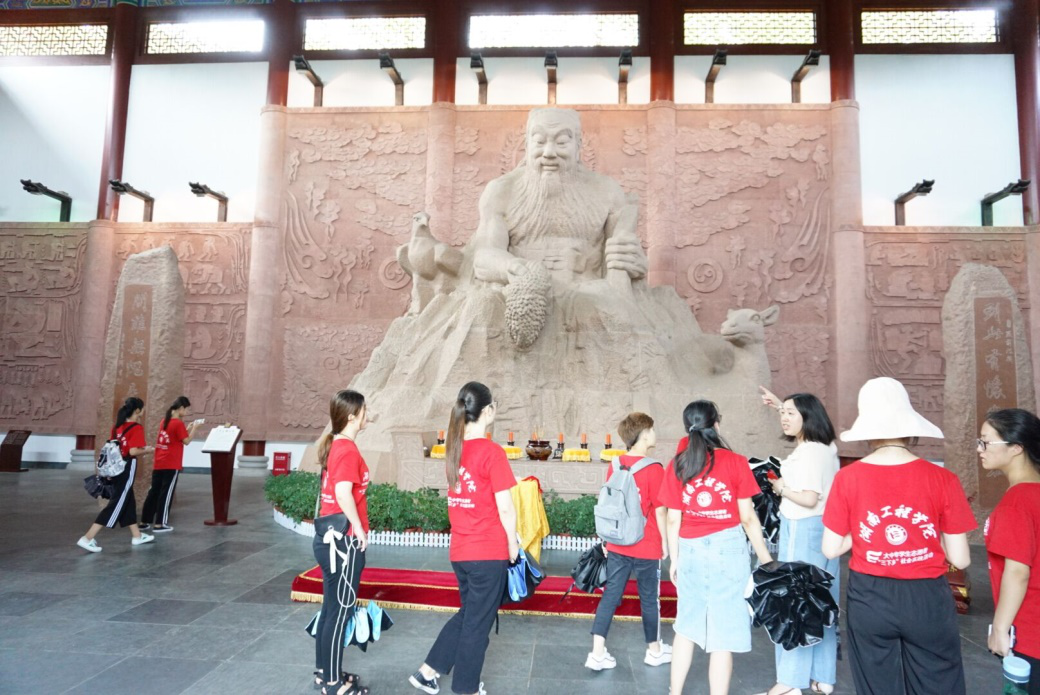 抵达炎帝陵景区后,实践队伍在神农大殿殿前观看了炎帝功德篇章表演,其中集体舞《围猎》展现了陷阱、围猎、追击这三种原始人主要的狩猎方式,演绎了原始人群居生活中采食植物果实、生火驱害等生存方法,表演富有感染力,让队员们仿佛身临其境,而节目《鹿原耕播》配乐气势恢宏、场景生动,展现了农耕文化自身独特文化内容和特征,揭示了中华文化的三个重要特征:民族多元性、历史传承性和乡土民间性,以现代歌舞来诠释先祖的开拓精神,队员们不经感叹原始人极强的生存能力与智慧;迎接来宾的《神农酒歌》曲调柔美,寓意美好,如同当地自产的米酒一样甘甜。在主持人的介绍下,队员们了解到客家民歌的演唱形式、音乐色彩和语言艺术十分古老和丰富。许多民歌珍品历传不衰,成为神农架人文化生活的一个重要组成部分,闪耀着古楚文化的灿烂光辉。薅草歌声情并茂,明快悠扬;婚礼歌脍炙人口,趣味盎然;丧礼歌音色古朴,粗犷苍凉;民间小调抒情状物,盛情真挚。在《舞动三节龙》环节,队员上台学习舞龙的环节,台下其他队员进行加油喝彩,在主持人的指导下舞龙的手法、动作逐渐娴熟,挥洒汗水间,感知炎帝文化的脉动。随后在互动环节,队员学上台学讲客家古语、学唱客家民歌,探知其传统文化中所重视的重教观念、寻根意识和探索精神。感知奇特而丰富多彩的民俗风情,找到学习和继承传统文化的切入点。在节目尾声,队员们纷纷上台跳竹竿舞,体验象征蓬勃兴旺的农耕文化,她们欢快的身影,脚尖在竹竿间的跃动和醒目的红色队服,释放青春气息,与传统文化风情相碰撞。