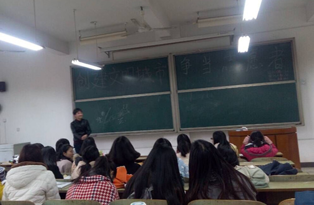 为了学习和弘扬雷锋精神,提高同学们学雷锋的积极性,调动更多的同学们加入学雷锋志愿者的行列。3月10日,英语1503和1504的同学们在教学楼D101举行了一场以 “创造文明城市,争当志愿者”为主题的团日活动。