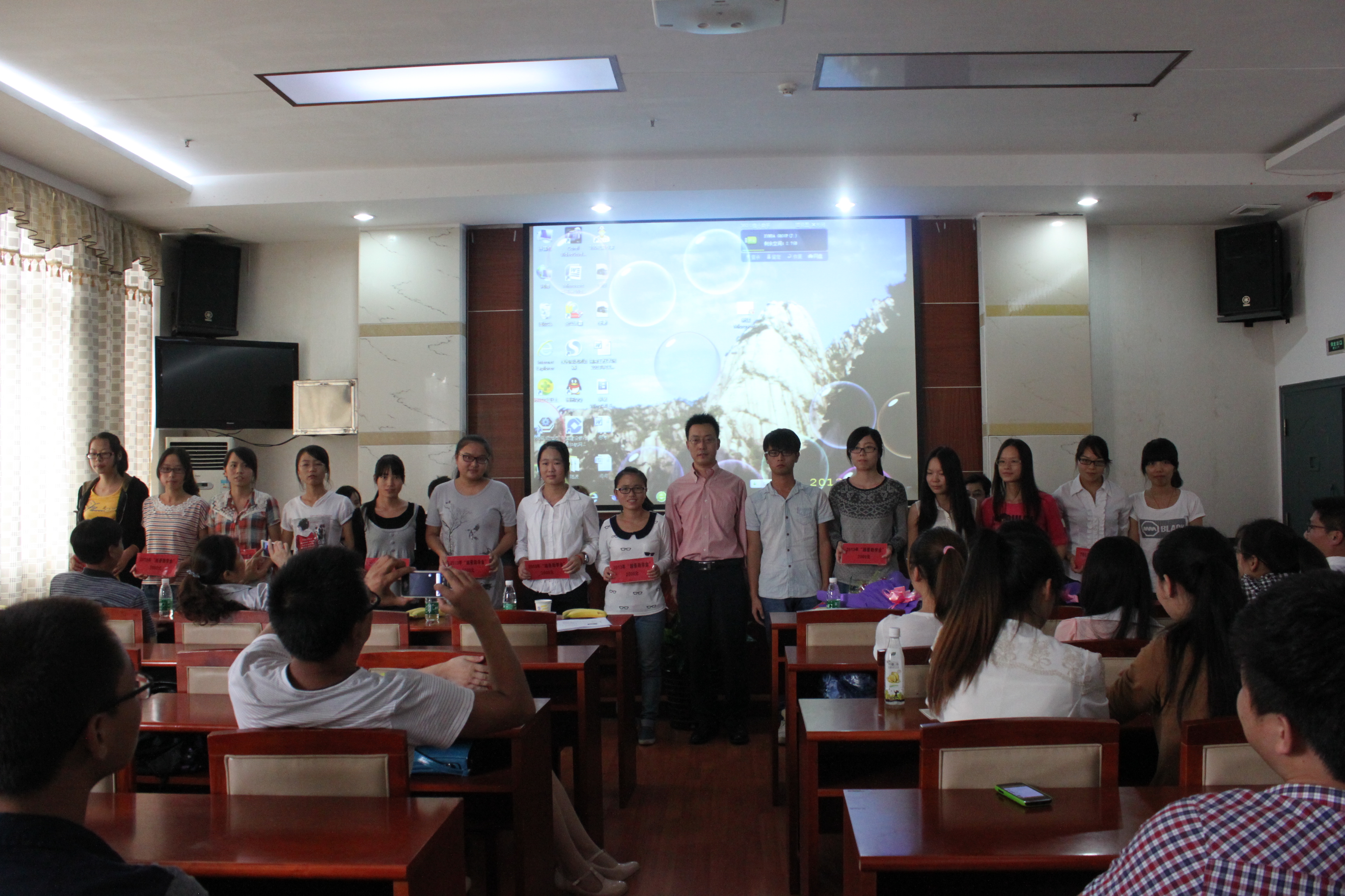 刘志慧、唐慧等十四位受助学生上台受捐,并与冯涛校友合影留念。同学们一起观看了钟信知校友的录像讲话,感受到了她的无限爱心和殷切期望。英语1004班鲁小晶同学作为受捐学生代表发言,她感谢“越景助学基金”对像她这样的学生的大力资助,同时呼吁广大学生要以冯涛、钟信知这样的成功校友为榜样,努力学习,以感恩的心回报母校,回报社会,争取把这枚爱的火炬传得更远,照得更亮。