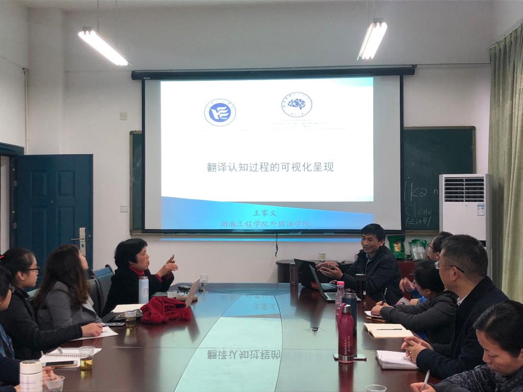 下半场,王家义做了题为“翻译认知过程的可视化呈现”的学术报告。首先,他从眼睛的生理性特征着手,提出眼动测量这一概念。研究者通过观察眼动的直接指标、注视类指标、瞳孔直径等,追踪被试者的心理活动状态,把眼动数据与认知过程对应起来,对心理活动进行精细分析,有效推测个人的认知过程。眼动追踪技术现已应用于自闭症儿童行为观察、广告设计、消费心理学等各个方面,以此为切入点,他重点介绍了眼动追踪翻译过程的相关研究。比如通过追踪被试者做常规阅读和翻译阅读时的各类指标,探讨阅读过程中是否同时存在翻译活动的问题。又如通过呈现视译和笔译的可视化进程,直观归纳译者对译文的加工和产出过程等。最后,他以自身从事的个案研究为例,介绍了翻译进程可视化的步骤和方法。