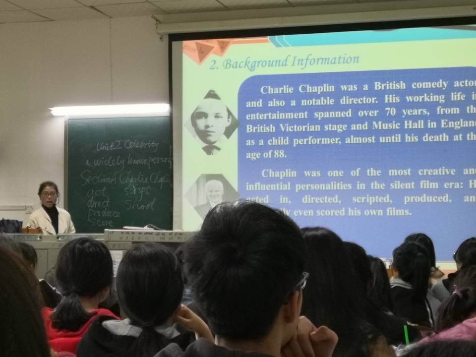 陈细波老师公开课讲授内容为《新视野大学英语》(4)Unit 2 Celebrity Section A: Charlie Chaplin, 授课对象为应用技术学院17级非艺术类会计学专业学生。陈细波老师以一则听力练习进行导入,引出查理·卓别林这一人物形象;背景信息部分包括介绍查理·卓别林的经典作品,欣赏短视频《流浪汉》,探讨并描述查理·卓别林所塑造的流浪汉这一经典荧幕形象;阅读活动部分为结合四级新题型的课文段落信息匹配练习;口语练习部分则是通过游戏形式,学习人物形象描述。