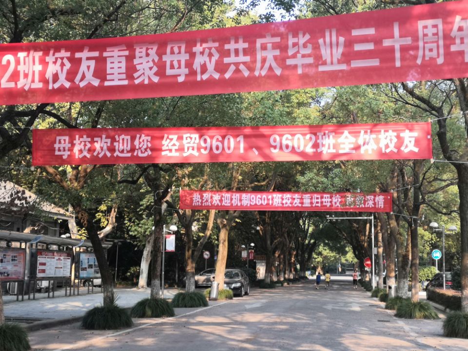 这是一个梦圆的时刻。10月4日上午,经贸英语96级校友与师生盼望已久的毕业二十周年聚会第一场活动如期而至,同学们一大早就来到昔日学习生活的南校区。见到昔日熟悉的下摄司街、焕然一新的校门的瞬间,很多同学都留下了激动的泪水。年已不惑的校友们一进校园仍然像个孩子,一个个都精神抖擞、生龙活虎起来。学校、学院的准备工作早已做好,欢迎横幅揭示着隆隆的喜庆氛围。当年的班主任李儒峰、唐心洁老师早已在校园内迎接返校学生,全程陪同。体育老师刘娟妮给大家上了一堂体育课,烈日炎炎之下大家玩击鼓传花、比拼平板支撑,还进行了一场男子篮球友谊赛,女生们还是象以往一样当啦啦队的小迷妹;回到第一教学楼,七十多岁的语文老师孙立湘教授给大家上了一节演讲与口才课,课前十分钟进行新闻播报,直接把每个同学的思绪拉回到二十年前。中午,大家回到当年的食堂用餐,品味美食,回味大学生活。中午,部分同学去老师家排练朗诵,为晚上师生表演进行准备。部分同学进入当年的宿舍,体验集体生活,感受母校情谊。