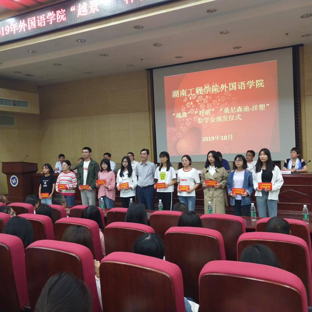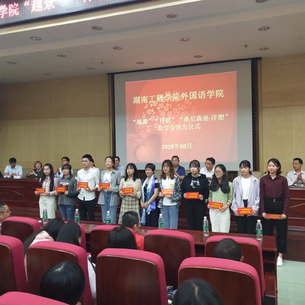 院长杨永和率先致辞。他向大家讲述了校友们的拼搏奋斗历程与校友助学金的设立情况,并代表受助学子,向捐赠校友表示诚挚谢意。随后,校友办主任陶宏向大家讲述了湖南工程学院的办学历史,并对各位校友心系母校、回报母校的优秀品质表示赞赏。外教Patti饱含深情地回忆了二十多年前在湖工的工作经历;“越景”助学金创始人钟信知校友鼓励学子努力学习,回报社会,并表示将提高助学金的支持力度;“桑尼森迪-洋塑”助学金创始人、湖南工程学院客座教授邓凌波先生讲述了个人在珠三角的奋斗历程,以亲身经历,鼓励大家努力拼搏,将来汇报社会。在党总支书记肖江淑宣读了35位受助学生名单之后,来自商英1602班的杨小丽同学作为获助学生代表发言,她向捐赠校友表示诚挚的谢意,承诺将刻苦学习,不忘恩情,不负学校和学长学姐们的深情厚意,并将这份恩情与鼓励传递下去。最后,钟信知、陶宏、许凌云和邓凌波颁发了助学金,受助学生上台领取助学金并合影留念。