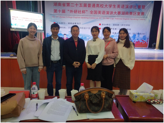 10月26-27日,湖南省第二十五届大学生英语演讲比赛暨第十届“外研社杯”全国英语演讲大赛湖南赛区复赛在长沙湖南第一师范学院举行。我校以杨永和、王家义为领队,陈锋、刘青、韩泽婷为指导教师以及6名选手组成的竞赛一组和竞赛二组两支代表队参加比赛,获得团体奖2项,个人奖6项。