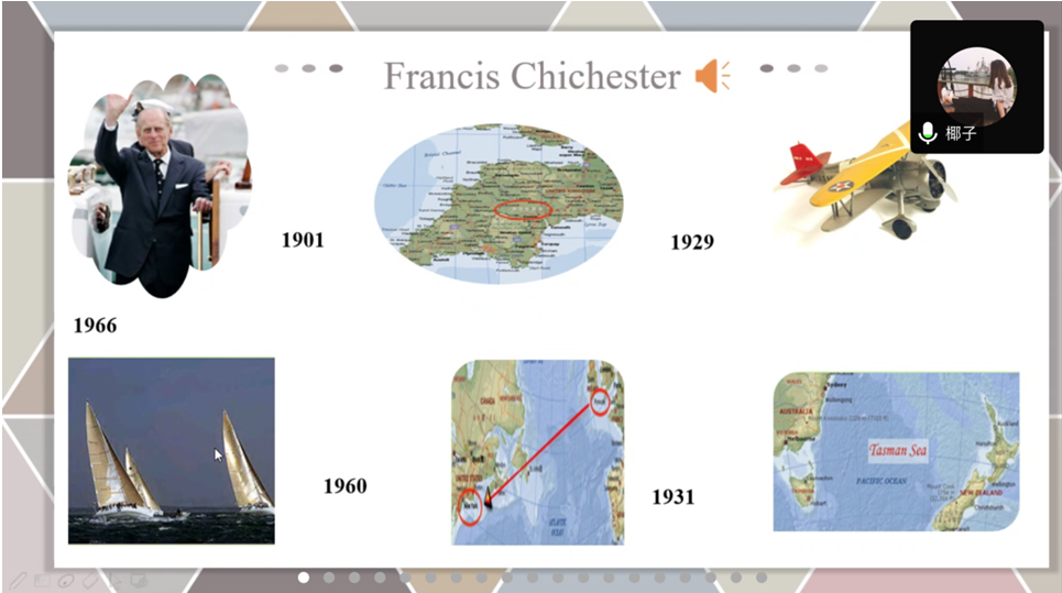 吕倩老师以大学英语精读第1册教程Sailing Round the World为讲授内容,首先介绍本堂课的活动安排,通过学生小组课堂展示回顾航行的历史、人物和意义,拓展单元背景知识,并由此引出航行的话题。随后,她运用启发式教学法,以时间数字为提示语,图文并茂地展示清晰的时间脉络,启发学生思考相关历史活动及意义。接着分析课文细节内容,通过设问引领学生回顾课文主要脉络,讲解新词汇和重要语法知识点,结合例子进行操练巩固,使学生能够举一反三,从而掌握新单元的语言知识。