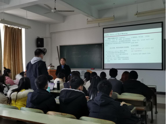 12月30日下午第5节课,英语教研室教师曾宇钧老师在A507举行了公开课,院领导杨永和以及来自英语教研室多名教师前往观摩。曾宇钧老师讲解的内容是翻译基础课程中的词语的翻译,她首先介绍了教学的目的及内容,她通过图片、视频、提问等多种方式,从词语的意义出发,通过译例的分析引导学生总结出词语的意义分类及翻译 同时,她还结合了时政新闻,联系到其背后的文化背景,在课堂上注入了思政元素。她态度认真,准备充分,内容熟悉,充分调动了学生的学习积极性。整个过程学生积极参与,课堂气氛热烈,教学效果良好课后,在教研室主任的主持下,对本次课进行点评,大家一致认为该公开课十分成功,课程设计非常完美,同时也在板书设计、例证的难度等方面提出了一些建设性意见。本次公开课为学院教师提供了一个相互交流和学习的平台,使大家在教学上得到了磨炼和提高,同时也充分展示了我院教师的风采。