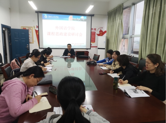 会议伊始,罗胜杰总结了开学以来我院在课程思政建设工作中取得的成绩,随后,对学校《关于进一步推进课程思政建设工作的通知》加以解读。他带领大家详细学习了文件精神,并结合《通知》,对学院全面推进“四全覆盖”课程思政建设工作作了具体安排。随后,他与大家一道,就如何挖掘课程思政元素进行了探讨,提出了在“领袖思想”、“社会主义制度优势”、“四史”、“国家战略规划”、“民族时代精神”等20个方面的思政元素挖掘参考方向,结合《湖南工程学院课程思政教学计划编制范本》,对学院包括两个专业全部课程和大学英语课程在内的所有课程思政教学大纲的制订工作作了具体布置,要求以课程组为单位,认真讨论,深入挖掘,集体制订,教研室严格把关,最后形成思政蓝本。最后,大家对如何开展课程思政,制定教学大纲展开了热烈讨论。