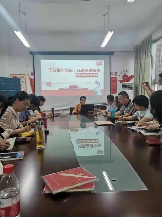 活动伊始,肖江淑带领全体党员重温入党誓词,重忆入党初心,表达了对党的无限忠诚以及对中国共产党成立100周年的美好祝愿。随后,她主讲了“学好百年党史,砥砺奋进征程”的党史教育专题党课,她从“为什么要学习党史”、“怎样学习党史”、“学了党史怎么干”三方面展开讲述。她强调:学习百年党史可以增强政治自觉、坚定理想信念、赓续精神血脉、做到知行合一。她联系实际,号召全体党员要创新思路,将百年党史学习教育与教学科研工作相结合,提高科研意识,提升队伍质量,增强自身本领、强化工作作风,攻坚克难,为学校的中心工作添砖加瓦。