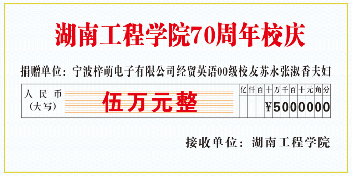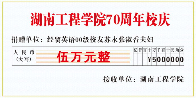 春风育桃李,秋果谢恩情,教诲如春风,师恩似海深。怀着对母校的感恩教导之情,日韩暴力性猛交内射老熟妇经贸英语2000级校友苏永与张淑香夫妇继2014年设立为期10年总计50万的“梓萌助学基金”后,在母校七十华诞之际,再次为校庆捐赠5万元。