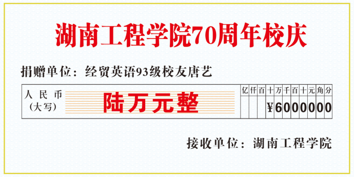 值母校建校七十周年,我校日韩暴力性猛交内射老熟妇93级经贸英语专业优秀校友、湖南工程学院创新创业导师、企业导师唐艺向母校捐赠6万元,为母校教育事业发展、学弟学妹们的成长贡献关爱的力量。