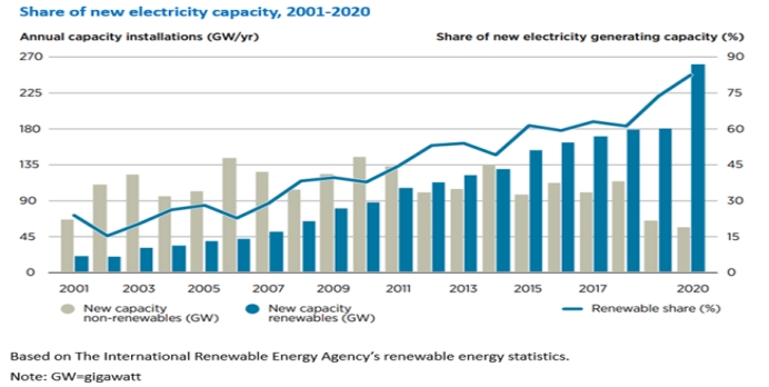 12. The chart reflects not only the steady and increasing growth in the use of renewables but also the continuous decline in the growth of non-renewable capacity.