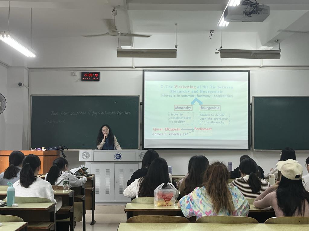 黄老师的公开课以《英国文学简史》为主要教材,授课对象为英语2003班全体学生。本次公开课主要讲授了17世纪英国文学的历史背景、影响因素以及主要文学流派。黄老师以17世纪代表诗人约翰·弥尔顿为例,详细讲解了这一时期文学背景及其创作特色,重点赏析了弥尔顿的代表作《失乐园》。学生全程注意力高度集中,课堂氛围良好。